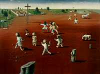 Portinari adorava pintar crianças brincando, e dizia:"Sabem por que que eu pinto tanto menino em gangorra e balanço? Para botá-los no ar, feito anjos."Pintando crianças brincando em mangueiras frondosas ou participantes de"peladas" de futebol e de festas de São João, todas elas trazem a lembrança da vida rural. A criança, agrupada em bandos, é apresentada com roupas claras e rústicas, geralmente em movimento, com gestos largos ou de posse de brinquedos manufaturados. Espantalhos, pipas, luas e estrelas são elementos recorrentes que refletem o apego à cultura rural e à paisagem do interior.Este universo infantil é povoado de elementos lúdicos, como brinquedos,brincadeiras e jogos: "Nossos brinquedos eram variados, conforme o mês, e também havia os para o dia e os para a noite. Para o dia eram: gude, pião, arco, avião, papagaio,