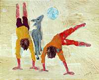 Palhacinhos na Gangorra foi pintado em 1957 sobre madeira compensada com tinta a óleo.Tem 54 centímetros de altura e 65 centímetros de largura