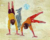 Moleques Pulando Cela é de 1958. Pintado com tinta a óleo sobre tela de tecido, tem 59 centímetros e meio de altura e 72 centímetros e meio de largura.